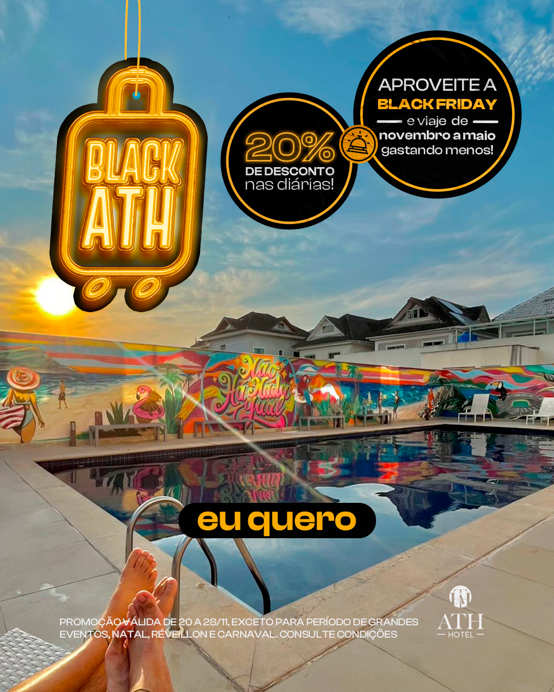 SAIBA MAISAproveite um dia incrível no ATH Hotel! Todas as opções de Day Use dão direito a um acompanhante como cortesia para você relaxar, se divertir e viver bons momentos em boa companhia.